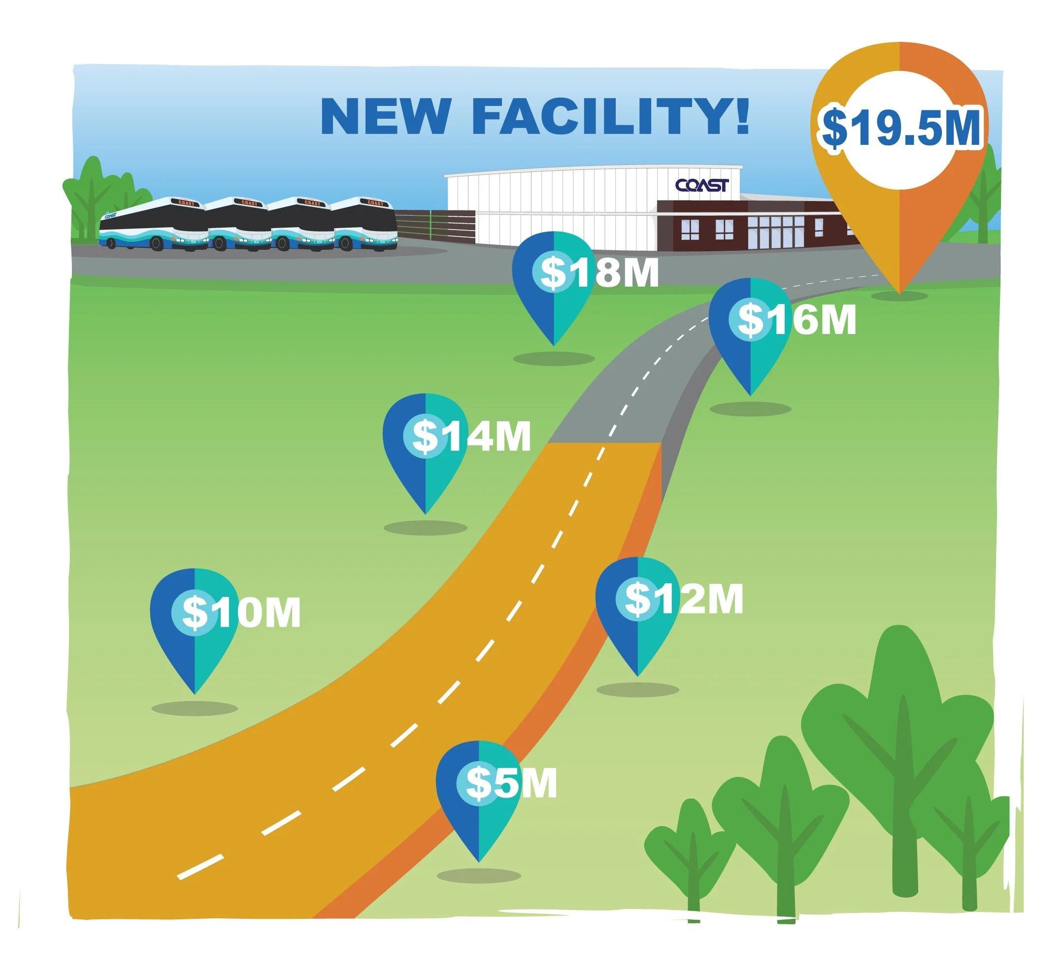 The project is being funded through a combination of public and private investments. COAST has secured $13.8 million in Federal Transit Administration (FTA) capital grants, and is pursuing additional FTA capital grant funding. The ability to spend these FTA grant funds is contingent on raising $3.4 million in matching funds. Those matching dollars have, and will, come from private foundations, businesses, and individual supporters.